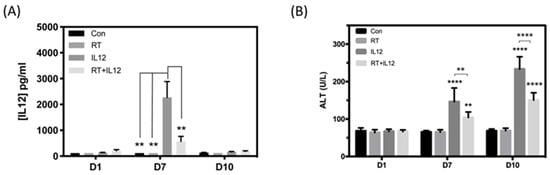 Combined modality therapy reduced the IL-12-induced toxicity on normal tissues. (A) The amount of IL-12 in plasma at days 1, 7, and 10 post treatment was quantified by ELISA assay. n = 3 in each group at day 1 and n ≥ 4 in each group at days 7 and 10. (B) The level of ALT in plasma was measured to assess the liver damage induced by IL-12 treatment. n ≥ 5 in each group. ** p < 0.01, **** p < 0.0001.