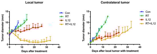 It has been reported that RT induces spontaneous tumor regression outside the irradiation field in some cancers; this process is termed the “abscopal effect” []. The above data demonstrated that the combination of IL-12 therapy with RT induced a highly synergistic effect. We further investigated whether the combined modality therapy evoked systemic anti-tumor activity on distant tumors. For this purpose, mice were first inoculated with tumor cells in their right legs (local site) and received treatments when the local tumor size reached 4 mm. Four days after injection of tumor cells in the right legs, an equal number of tumor cells were inoculated into the left legs (contralateral site) and tumor growth was monitored. The results showed that contralateral tumors in the RT group continued to expand at the same growth rate as those of the control group, indicating that RT alone did not induce the abscopal effect (Figure 5). Intratumoral administration of IL-12 alone inhibited local tumor growth and significantly retarded the growth rate of contralateral tumors. The combined modality therapy effectively suppressed local tumor growth and exerted a similar therapeutic effect to that of IL-12 alone on contralateral tumors. These results revealed that IL-12 therapy significantly improved the efficacy of RT against local tumors. Moreover, the IL-12-induced anti-tumor effect on distant tumors was not compromised by RT.