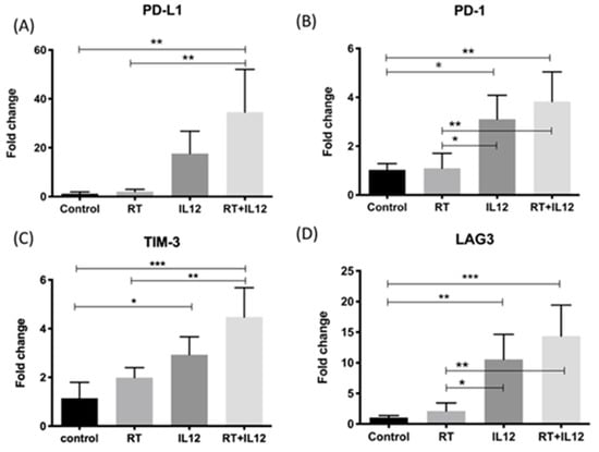 The T cell exhaustion-associated genes were upregulated in IL-12 alone and combined modality groups. The gene expression levels of (A) PD-L1, (B) PD-1, (C) TIM-3, and (D) LAG-3 in each tumor at day 7 after treatments was examined by real-time PCR. n = 4 in each group. * p < 0.05, ** p < 0.01, *** p < 0.001.