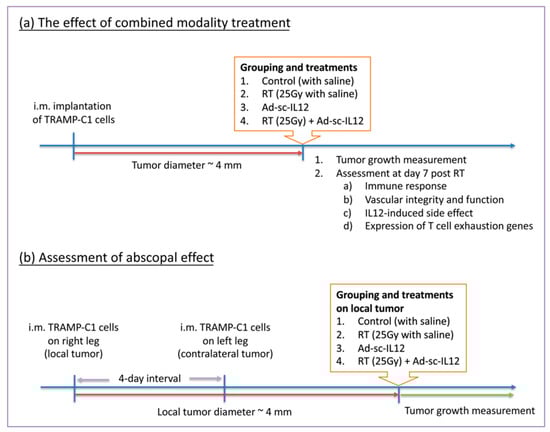 To examine the effect of combined modality treatment, TRAMP-C1 cells (3×106 cells in 0.1 mL PBS) were implanted intramuscularly (i.m.) in the right leg of C57BL/6J mice. All of the treatments were initiated when tumor diameter reached 4 mm in average. Mice were randomized into four groups, including control, radiation therapy (a single, high dose of 25 Gy or fractionated dose of 8.9 Gy per fraction for five times), IL-12 treatment, and combined modality with radiation therapy and IL-12 treatment. The protocol of irradiation was described clearly in our previous publication []. Briefly, tumor-bearing mice were anesthetized by a mixture (1:1) of ketamine (50 mg/kg, Merial Laboratoire de Toulouse, Toulouse, France) and xylazine (20 mg/kg, Bayer HealthCare Animal Health, Leverkusen, NRW, Germany) and were restrained during irradiation. The tumors were covered with a 1-cm bolus on the surface and irradiated by 6 MV X-rays from a linear accelerator with a dose rate of 2–3 Gy/min. Ad-sc-IL12 adenovirus was kindly provided by Prof. Min-Hua Tao, Academia Sinica, Taipei, Taiwan. For IL-12 treatment, normal saline or Ad-sc-IL12 virus (1 × 108 pfu per mouse) was intratumorally injected at three different parts of tumors, post irradiation. Tumor growth was determined by measuring diameters in two dimensions with a vernier caliper, with at least three mice for each time point. For assessment of abscopal effect, mice were first inoculated with TRAMP-C1 cells (3 × 106 cells in 0.1 mL PBS) in their right legs (local site) and received treatments when the local tumor size reached 4 mm. Four days after injection of tumor cells in the right legs, an equal number of TRAMP-C1 cells were inoculated into the left legs (contralateral site) and tumor growth was monitored. The experimental flowchart is shown in Figure 7.