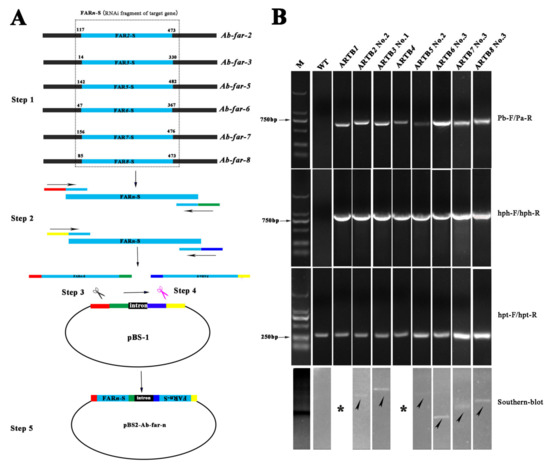 According to the method described by Ding et al. [21], Ab-far-n hpRNA transgenic B. cinerea were obtained and cultured at 25 °C for later use in subsequent experiments. Genomic DNA of transgenic B. cinerea was extracted from the hygromycin-tolerant generation, as described previously [40]. Ab-far-n (n: 1–8) hpRNA transgenic B. cinerea (ARTBn) were selected and identified by PCR with the primers (Table S2) and used as the control. The PCR fragments obtained were sequenced to ensure accuracy. For Southern blot analysis, the primers, Hph-DIG-F/Hph-DIG-R (Table 1), were designed to amplify the DIG-labeled probes. Approximately 10 μg genomic DNA from ARTBn was digested with EcoRI. The digested DNA was separated on a 0.8% agarose gel and then transferred to a Hybond-N+ membrane (Amersham, Little Chalfont, UK) [41,42]. Hybridization and detection were performed with a Dig High Primer DNA Labeling and Detection Starter Kit I (Roche, Basel, Switzerland) according to the manufacturer’s instructions. Equal amounts of genomic DNA from WTB were used as controls.