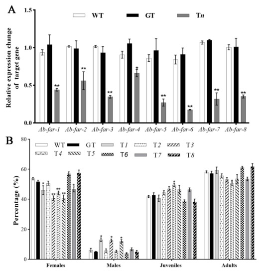 Ab-far-n expression and proportion of females, males, juveniles and adults of Aphelenchoides besseyi fed Ab-far-n hpRNA transgenic Botrytis cinerea. (A) Ab-far-n expression levels. (B) Proportion of females, males, juveniles and adults of Aphelenchoides besseyi. WT, nematodes cultured on wild-type B. cinerea; GT, nematodes cultured on eGFP hpRNA transgenic B. cinerea; T1-T8, nematodes cultured on Ab-far-1 to Ab-far-8 hpRNA transgenic B. cinerea. To determine silencing efficiency of gene, the gene expression from WT was normalized as 1 and fold change was calculated using the 2-ΔΔCt method to determine change in expression of the genes of interest. Values of figure A are means ± standard error, n = 9. Values of figure B are means ± standard error, n = 10. Asterisks indicate values that are significantly different from the WT treatment (* p < 0.05, ** p < 0.01; t-test).