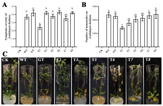 Previous studies have demonstrated that the reproduction and pathogenic effects of RWTN on the host were inhibited by in vitro RNAi and fungal-mediated RNAi of Ab-far-1 and Ab-far-4 [12,21]. It has been confirmed that RWTN infected A. thaliana and caused recognizable symptoms, and proposed a method to determine the pathogenicity and reproduction rates of RWTNs using A. thaliana as a model host plant [26]. To test the effects of the other six genes on the pathogenicity of RWTN, 100 mixed-stage RWTNs extracted from the T2–3, T5–8, WT, and GT treatments were inoculated on the leaves of A. thaliana for 21 days. The results showed that the symptom severity (Figure 4B,C) and reproduction (Figure 4A) in A. thaliana inoculated with RWTNs from the T2 treatment were significantly lower than those of the WT and GT treatments (p < 0.05, respectively), whereas the other treatments showed no significant difference compared with the WT and GT treatments. Therefore, it was speculated that Ab-far-2, as well as Ab-far-1 and Ab-far-4, played an important role in the pathogenic process of RWTN.