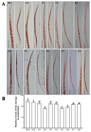 The detection results of the fat storage of RWTN from each treatment (Table 3) showed that the fat storage of RWTN from the T2, T5, and T6 were significantly decreased by 26.87%, 26.24%, and 21.98% compared with the WT treatment (p < 0.05 for each), respectively (Figure 5). Although the fat storage of RWTN from the T1, T3–4, T7, and T8 treatments also decreased compared with the WT and GT treatments, these differences were not significant, and the difference between the WT and GT treatments was also not significant (Figure 5). Therefore, silencing Ab-far-2, Ab-far-5, and Ab-far-6 in RWTN might also affect the fat storage and metabolic processes of the nematodes.