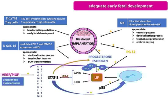 Creation of utero environment for appropriate endometrium receptivity, trophoblast proliferation, and embryo nesting. COX-2, cyclooxygenase-2; ECM, extracellular matrix; ER, estrogen receptors; GP130, glycoprotein 130; IL-1β, interleukin-1β; IL-6, interleukin-6; JAK-2, Janus kinase 2; LIF, leukemia inhibitor factor; LIFR, membrane LIF receptor; MMP-3, metalloproteinase-3; NK, natural killer; p53, tumor protein p53; PlGF, placental growth factor; PR-A/PR-B, progesterone receptors; STAT-3, signal transducer and activator of transcription 3; Th1/Th2, T cells involved in inflammatory response; Treg, T-regulatory cell profile; WOI, window of implantation; VEGF, vascular endothelial growth factor.