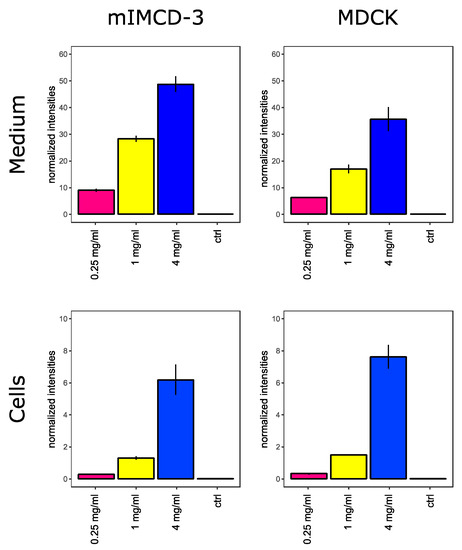 To assess metabolic alterations induced by highly concentrated vancomycin, we treated mouse inner medullary collecting duct cells (mIMCD-3 cells) and Madin–Darby canine kidney cells (MDCK cells) with control media and media containing 0.25 mg/mL, 1 mg/mL or 4 mg/mL vancomycin. During these experiments, no major changes regarding morphology or cell number were observed (data not shown). As displayed in Figure 1, both cell lines have taken up vancomycin in a dose-dependent manner.