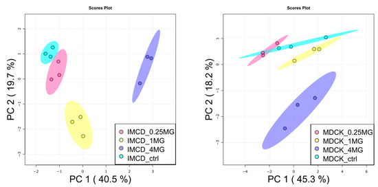 Next, the lipophilic extracts were analyzed by targeted lipidomic analysis. Marked differences were unveiled in the baseline lipidomic profile of the two cell lines (Supplementary Figure S1). Additionally, the two cell lines behaved differently towards vancomycin exposure: only slight differences were observed in the PCA of MDCK cells between the control and 4 mg/mL vancomycin, whereas in mIMCD-3 cells, these conditions were clearly separated from each other (Figure 4).