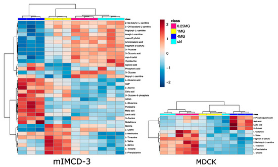 Statistical analysis revealed 35 significantly altered metabolites (one-way analysis of variance (ANOVA), corrected for multiple testing by false discovery rate (FDR), q-value < 0.05) in mIMCD-3 cells and 11 significantly altered metabolites in MDCK cells. Detailed results of statistical analyses can be found in supplementary Table S1. These numbers also reflect the more profound impact of vancomycin on mIMCD-3 cells in comparison to MDCK cells as seen in the PCA (Figure 2). In Figure 3, these significant alterations are displayed in heat maps, in which range-scaled z-scores are shown. In both cell lines, distinct clustering is visible between control and 4 mg/mL vancomycin treatment.
