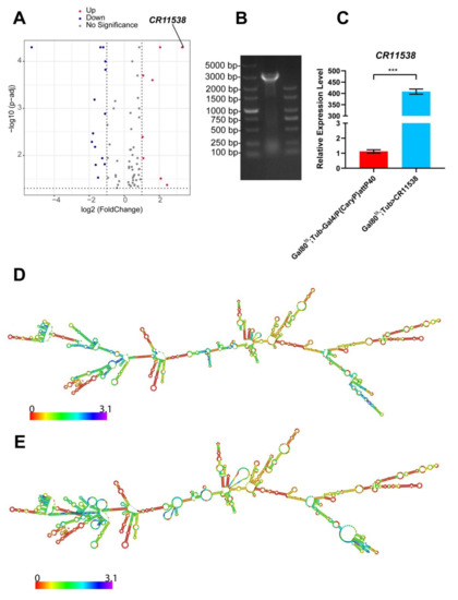 In this study, we investigated the most significantly upregulated lncRNA-CR11538 demonstrated by our previous work (Figure 1A) [46], and it was predicted to have no open reading frame by multiple bioinformatics tools. To explore whether lncRNA-CR11538 can participate in the regulation of Drosophila immunity responses, we constructed the CR11538-overexpressing flies using the pUAST-attB plasmid method, and confirmed that lncRNA-CR11538 was successfully constructed to the desired position in Drosophila genome (Figure 1B). To overexpress Drosophila lncRNA-CR11538 in a specific period of time, these overexpressing lncRNA-CR11538 transgenic flies were transiently driven by a temperature sensitive Tub-Gal80ts; Tub-Gal4 flies were especially influenced; the expression level of lncRNA-CR11538 was about 400 times higher than the control (Figure 1C). Additionally, the total length of lncRNA-CR11538 is 2386 bp, and its secondary structure was predicted by applying the minimum free energy and thermodynamic ensemble method, respectively [47,48]. As shown in Figure 1D,E, the secondary structure of lncRNA-CR11538 is very complex.