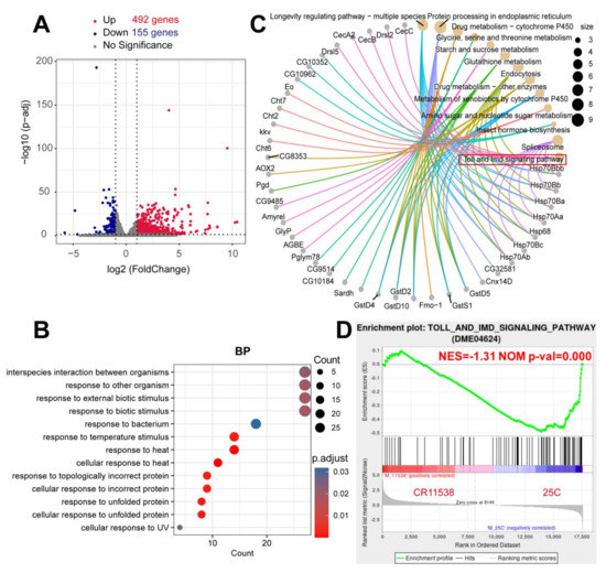 Enrichment analysis of DEGs in the CR11538-overexpressing flies after stimulation with M. luteus. (A) Volcano map showing DEGs among Gal80ts; Tub> CR11538 and Gal80ts; Tub-Gal4/P{CaryP}attP40 after M. luteus challenge. Red: upregulated genes (>2-fold difference in relative expression and adjusted p < 0.05); blue: downregulated genes (<−2-fold difference in relative expression and adjusted p < 0.05). (B) Biological process enrichment analysis results were obtained using all DEGs. (C) Network diagram showing pathways and corresponding genes in KEGG pathway enriched with all DEGs. “size” represents the number of differentially expressed genes (DEGs) contained in each pathway. (D) GSEA analysis on the RNA-seq data between the CR11538-overexpressing flies and the control. The GSEA diagram is divided into three parts. The first part is the line graph of gene Enrichment Score. The second part uses lines to mark the genes under the gene set. The third part is the rank value distribution map of all genes.
