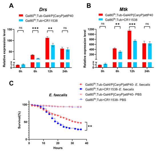 lncRNA-CR11538 inhibits Toll signaling pathway in vivo. Drs (A) and Mtk (B) expression levels in the CR11538-overexpressing flies at different time points (0 h, 6 h, 12 h, 24 h) after M. luteus infection. (C) Changes in the survival rate of the CR11538-overexpressing flies and the control flies treated with PBS or E. faecalis. Measurements made after 36 h. Gal80ts; Tub-Gal4/P{CaryP}attP40-PBS (n = 115), Gal80ts; Tub > CR11538-PBS (n = 118), Gal80ts; Tub-Gal4/P{CaryP}attP40-E. faecalis (n = 108), Gal80ts; Tub > CR11538-E. faecalis (n = 109). For all tests, p value < 0.05 was considered as statistically significant. ** p < 0.01, *** p < 0.001 and ns, no significance vs. the control groups.