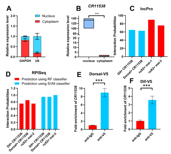 LncRNA-CR11538 interacts with Dif/Dorsal. (A) U6 and GAPDH are marker genes used to confirm partitioning between nucleus and cytoplasm. (B) LncRNA-CR11538 expression in nucleus and cytoplasm detected by RT-qPCR. Predicted scores for interaction potential of lncRNA-CR11538 with Dif or Dorsal via IncPro (C) and RPISeq (D) databases. LncRNA-CR11538 fold enrichment measured by RIP-qPCR using anti-V5 antibody to immunoprecipitate overexpressed Dorsal-V5 (E) and Dif-V5 (F) in S2 cells. For all tests, p value < 0.05 was considered as statistically significant. *** p < 0.001 vs. the control groups.