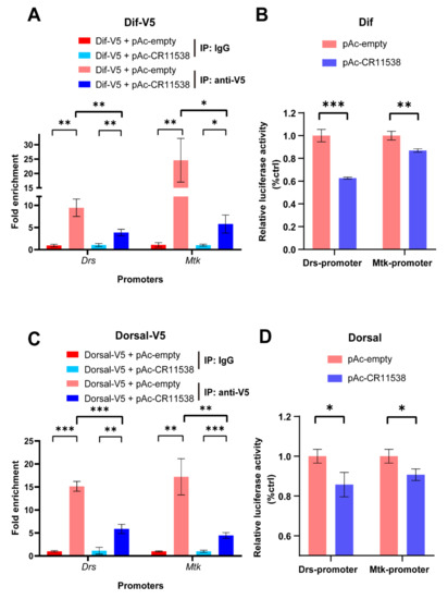 2.3. LncRNA-CR11538 Prevents Binding of Dif/Dorsal to AMPs Promoters