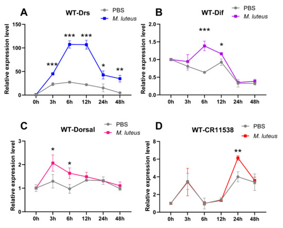 LncRNA-CR11538 facilitates immune homeostasis recovery. The dynamic expression levels of Drs (A), Dif (B), Dorsal (C), lncRNA-CR11538 (D) in the wild-type Drosophila infected with M. luteus were detected by qRT-PCR at 0 h, 3 h, 6 h, 12 h, 24 h and 48 h after stimulation. For all tests, p value < 0.05 was considered as statistically significant. * p < 0.05; ** p < 0.01 and *** p < 0.001 vs. the control groups.