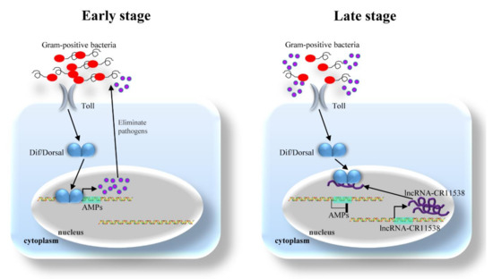 Schematic illustration of the mechanism by which lncRNA-CR11538 facilitates immune homeostasis recovery. Left diagram: In the early stage of immune response, Gram-positive bacteria activate Toll signaling pathway and promote Dif/Dorsal entering the nucleus to enhance AMP transcriptions, thereby eliminating pathogens. Right diagram: In the late stage of immune response, redundant AMPs increase the expression of lncRNA-CR11538, which acts as a Dif/Dorsal decoy to sequester them away from AMP promoters and inhibits the transcriptions of AMPs to restore immune homeostasis.