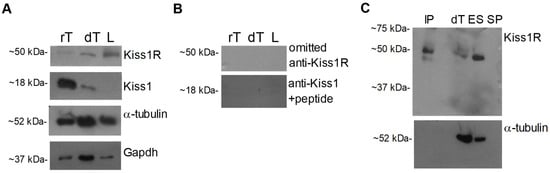 - Salehi, S.; Adeshina, I.; Chen, H.; Zirkin, B.R.; Hussain, M.A.; Wondisford, F.; Wolfe, A.; Radovick, S. Developmental and Endocrine Regulation of Kisspeptin Expression in Mouse Leydig Cells. Endocrinology 2015, 156, 1514–1522. [Google Scholar] [CrossRef][Green Version]