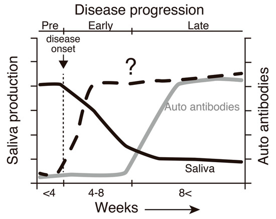 Disturbances in immune tolerance may lead to autoimmune reactions [15]. In a previous study, SATB1cKO mice begin to die after 24 weeks of age due to renal failure, most likely caused by lupus nephritis associated with systemic lupus erythematosus (SLE) [11]. Notably, salivary gland dysfunction is observed in SATB1cKO mice as early as 4 weeks of age, with the maximum severity observed at ~8 weeks after birth [16]. Immune cell infiltration and the destruction of the salivary gland structure were observed in SATB1cKO mice, which is also a characteristic feature observed in patients with SS [16]. Therefore, SATB1cKO mice were used as the mouse model for SS. Since individual variations in the onset and progression of SS disease have been observed in other SS model mice, SATB1cKO mice are useful tools for analyzing SS pathogenesis, especially in the early phase of the disease. We previously demonstrated that the levels of anti-SSA and anti-SSB antibodies, which are used in the clinical diagnosis of SS, are upregulated when saliva production reaches its lowest levels in SATB1cKO mice [16]. This finding implies that markers other than the presence of autoantibodies are necessary to properly diagnose SS in the early phase of the disease when the exocrine function is maintained (see Figure 1).