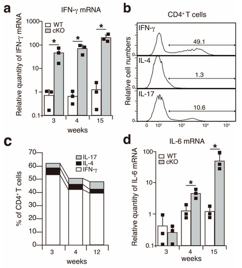 We previously demonstrated that SATB1cKO mice are prone to autoimmune diseases and develop SS-like symptoms, such as the loss of saliva production and the infiltration of immune cells in the salivary glands as early as 4 weeks after birth [11,16]. In addition, lacrimal gland dysfunction was also observed in the SATBcKO mice after 4 weeks of age (data not shown). Although the pathophysiology is thought to vary across patients with SS, the involvement of interferon γ (IFN-γ) in SS pathogenesis has been suggested in some patients with SS and the SS mice model [19,20,21]. Therefore, we first quantified IFN-γ expression in the salivary glands of the SATB1cKO and wild type (WT) mice. The quantitative PCR analysis showed that IFN-γ expression was upregulated in the salivary glands of the SATB1cKO mice even at 3 weeks of age, a week earlier than the onset of SS, which led to the reduction in saliva production (Figure 2a). CD4+ helper T (Th) cells infiltrate the salivary glands of the SATB1cKO mice [16]. We examined the expression of signature cytokines produced by these Th cells. We observed that most Th cells in the salivary glands of the SATB1cKO mice were IFN-γ-producing Th1 cells (Figure 2b,c). The percentage of Th1 cells in the total CD4+ T cell population that infiltrated the salivary glands of the SATB1cKO mice was not significantly different but showed a minor reduction between 3 and 12 weeks after birth (Figure 2c). Distinct Th17 cells were also observed in addition to Th1 cells; however, very few Th2 cells were present in the SATB1cKO salivary glands (Figure 2b and 2c). In addition to IFN-γ, IL-6, a pro-inflammatory cytokine, was also expressed in SATB1cKO salivary glands after 4 weeks of age (Figure 2d), implying that inflammation is observed following prominent salivary gland destruction in the SATB1cKO mice.