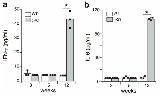 Inflammatory cytokines are present in the serum of SATB1cKO mice in the late but not the early phase of SS. The levels of IFN-γ (a) and IL-6 (b) were quantified in the serum obtained from WT (open bar) and SATB1cKO mice (filled bar) at different ages indicated in the figures. Dots in the graph indicate individual values (n = 3). The Student’s t-test was used for statistical analysis (* p < 0.05).