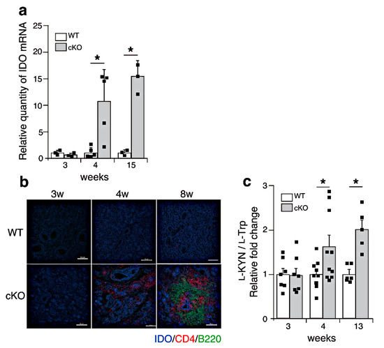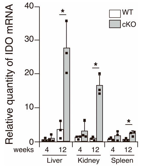 SATB1cKO mice develop SS and SLE. However, indicators of SLE, such as anti-dsDNA antibodies in the serum and deposition of immune complexes in the kidney, are observed after 12 weeks of age [11]. Therefore, it is plausible that IDO is expressed systemically after a certain age in SATB1cKO mice. To address this issue, we examined the IDO mRNA expression in various organs of the WT and SATB1cKO mice at 4 and 12 weeks of age, at the onset of symptoms of SS and SLE, respectively [11,16]. IDO expression was slightly increased in the spleen of the SATB1cKO mice 4 weeks after birth (Figure 5). In the 12-week-old SATB1cKO mice, a significantly higher IDO expression was observed in the liver and kidney of the SATB1cKO mice than that in the WT mice (Figure 5), implying that IDO expression may be induced in multiple organs when an autoimmune reaction activates systemic inflammatory responses.