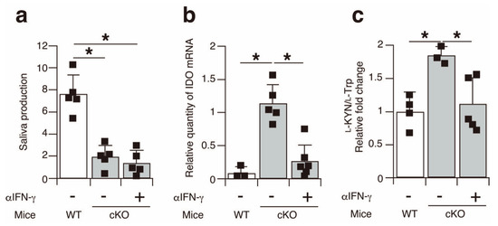 Finally, to elucidate the causative relationship between IFN-γ and IDO expression in the salivary glands of the SATB1cKO mice, we intraperitoneally injected neutralizing IFN-γ antibodies into the 3-week-old SATB1cKO mice every 3 days, with a total of 20 injections, to inhibit IFN-γ function. No improvement in saliva production was observed in the SATB1cKO mice injected with anti-IFN-γ antibodies (Figure 6a), despite reports stating that IFN-γ is necessary for SS pathogenesis in some mouse models [21]. Nevertheless, IDO expression was significantly lower in the salivary glands of the anti-IFN-γ-treated SATB1cKO mice (Figure 6b). In addition, serum l-KYN levels decreased in the SATB1cKO mice following the anti-IFN-γ-antibody injection (Figure 6c). These results demonstrate that the induction of IDO expression in the salivary glands of the SATB1cKO mice is mediated by IFN-γ. Overall, the results of this study suggest that serum l-KYN can be a useful marker for the diagnosis of SS in the early phase before the generation of autoantibodies.
