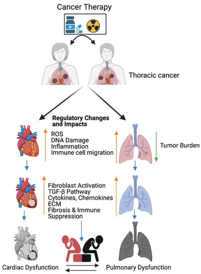 Thoracic cancers include thymic and windpipe (tracheal) cancers, breast cancer-induced lung metastasis, and non-small cell lung cancers (NSCLCs) as the most common []. The cancer may be primary or may originate from other sites such as the prostate, breast [,], and pancreatic cancers cells [], and migrates to the thoracic region and causes lung cancer. Treatment options depend on the stage and type of cancer, which includes surgical removal of cancer tissue followed by chemotherapy or radiation, or a combination of chemoradiation therapy (CRT) and immunotherapy. CRT is the preferred treatment option for thoracic malignancies; however, while it can increase cancer-free survival, it parallelly promotes acute and chronic cardiopulmonary toxicities. The lungs are one of the most sensitive tissues to ionizing radiation and this sensitivity limits the success of radiotherapy for lung cancer treatment. CRT causes early toxicity, occurring within hours to a few days after exposure, and late toxicity, occurring months after the treatment which includes cardiopulmonary tissue fibrosis, inflammation, and alteration of cellular immunity [,,,,,]. Radiation therapy promotes immune suppression via immune modulator programmed death ligand-1 (PD-L1) in cancer patients. These toxicities lead to cardiac myopathy, hypertension, myocarditis, left ventricular dysfunction, ventricular arrhythmias, pulmonary edema, pulmonary hemorrhage, and pulmonary pneumonitis [,,,,,,,,,,,,].