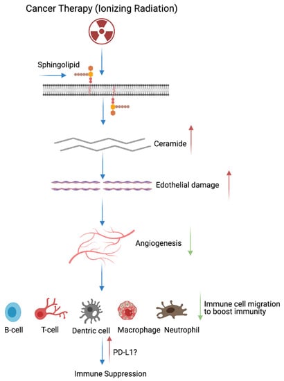 Cancer therapy promotes immune suppression. Cartoon illustrates that radiation therapy directly acts on the plasma membrane bound sphingolipids, cleaves sphingolipids, and generates ceramide through sphingomyelinases. This process leads to the accumulation of ceramide in the injured tissue, causes endothelial cell damage, and inhibits angiogenesis (blood vessel formation). Angiogenesis inhibition restricts the recruitment of immune cells through the bloodstream to the damaged site/inflamed area. Failure in the recruitment of immune cells (neutrophils, macrophages, T cells, B cells, and dendric cells) leads to programmed death ligand-1 accumulation and immune suppression. Note: Up allow indicated the increased process and down arrow indicates inhibited/repressed process. This graphic/cartoon is created with BioRender.com agreement # MJ22YQRUWX.