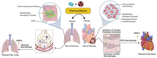 The combination of chemotherapy and radiation therapy is the most effective treatments for breast, esophageal, and lung cancers. However, the combined therapy promotes early non-symptomatic cardiopulmonary fibrosis responsive risk factors, including the platelet-derived growth factor (PDGF), tumor necrosis factor (TNF), TGFβ, interleukins (IL-1, IL-6, and IL-8), and neutrophil infiltration. Additionally, these treatments induce the late cardiopulmonary fibrogenesis responsive transforming growth factor, IL-4, and IL-13 [,]. Histopathological results clearly demonstrate that fibrosis areas are rich in myofibroblast cells, inflammatory cells, and extracellular matrix collagen depositions (ECM) in injured cardiopulmonary organs [,]. TGFβ-SMAD-signaling is well studied and characterized in fibrosis models [,]. Subsequent accumulation of the ECM in the cardiac tissues leads to myocardial fibrosis, deregulation of heart function, and cardiac failure. Similarly, radiotherapy causes pulmonary pneumonitis and pulmonary fibrosis, which lead to pulmonary remodeling, dysfunction, and pulmonary failure [] (Figure 1).