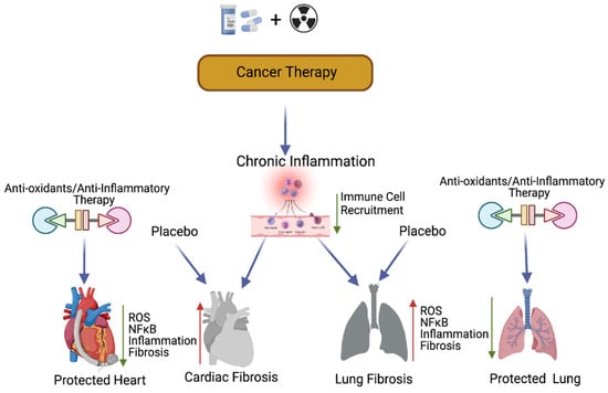 Lung cancer or thoracic cancers are frequently managed with immunotherapy, radiation, chemotherapy as monotherapy, or radiation combined with chemotherapeutic agents, such as platinum (cisplatin and carboplatin), microtubule inhibitors taxanes (docetaxel and paclitaxel), blood vessel formation inhibitors (bevacizumab), epidermal growth factor inhibitors (erlotinib and necitumumab), and immunotherapies [] (nivolumab, pembrolizumab, atezolizumab, and ipilimumab). Cancer therapeutics cause cardiopulmonary toxicities including hypertension and myocardial ischemia [,,,,,,,], and this is accepted by the American Cancer Society and American Heart Association. According to the US National Cancer Institute (NCI) and based on our previous knowledge, chemotherapy or immunotherapy promote toxicity/inflammation in non-target organs and these inflammations invite migration of neutrophils, macrophages, and cytotoxic lymphocytes to injured and non-injured sites []. These immune cells secret cytotoxic substances, proinflammatory cytokines, chemokines, and growth factors that lead to chronic inflammation [] (Figure 1).