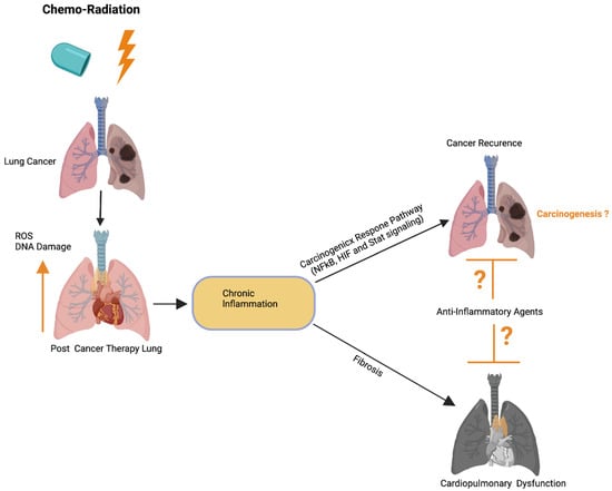 The increasing population of malignant patients undergoing cancer therapy are suffering from cardiopulmonary dysfunction, cardiopulmonary inflammation, and cancer recurrence following cancer therapy. There are many biomarkers that have demonstrated the ability to predict cardiopulmonary toxicity before the occurrence of clinical signs or symptoms []. However, many viable biomarkers do not satisfy the strict criteria, including the solid and easy use of assays, good sensitivity, and specificity. The application of omics technology, such us protein mass spectrometry, metabolomics, whole-genome sequencing, whole-exome sequencing, 10 X spatial visium genomics, and single-cell transcriptomics, is warranted to identify early and late cancer therapy-induced toxicity response biomarkers and tumor relapse biomarkers. Cancer therapy-induced cardiopulmonary inflammation also drives the oncogenesis recurrence and drug resistance in lung cancer patients; however, only a limited amount of evidence is available to support the notion that cancer therapy-induced inflammation promotes oncogenesis and further studies are warranted to prove this concept unambiguously. Patients show late symptomatic cancer therapy-induced cardiopulmonary toxicities after 5–10 years post-treatment, which are irreversible. In order to save patients from therapy-induced non-malignant mortalities, it is warranted to fuse/co-admit chemo-radio protectants such as antioxidants [] in addition to chemoradiation therapy. Recent advancements in immunotherapy as well as in the application of engineered T cells or CART T cell therapeutic strategies may be possible options to target cardiopulmonary fibrosis [,] for the purpose of clearing scar tissues from wounded tissues and maintaining the physiological state of cardiopulmonary cells. It appears that drug-induced cardiopulmonary adverse side effects are genetically determined. Human-induced pluripotent stem cells are best suited for pharmacogenomics research because they are genetically identical to the patients from whom they are derived and can be obtained non-invasively [,]. Therefore, pluripotent stem cell technology is highly recommended to investigate the pharmacogenomics of chemotherapy-induced adverse cardiopulmonary effects and this technology potentially could both identify the mechanisms of toxicities and validate the causal genetic variants that contribute to such toxicities.
