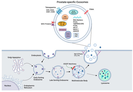 Biogenesis of prostatic exosomes. Endocytosis via cell membrane invagination creates an early sorting endosome (ESE), which combines with other ESEs from the Golgi apparatus and the endoplasmic reticulum to create a late sorting endosome (LSE). Via ESCRT-dependent or ESCRT-independent mechanisms, further invagination creates ILVs within a multivesicular body (MVB). The MVB may either be shuttled to a lysosome for degradation or to the cell surface with the help of MVB docking proteins, such as Rab GTPases 27a and b, to expel its contents, including exosomes, out of the cell. Prostate-specific exosomes (top) contain nonspecific exosome biomarkers, such as heat shock proteins and tetraspanins, while also including kallikreins, PSMA, PCA3, and TMPRSS2:ERG, which are specific to exosomes of prostatic origin.