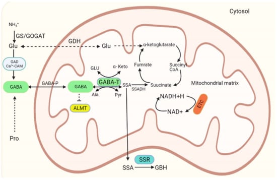 GABA is produced by a metabolic pathway known as the GABA shunt pathway, which was first observed in plants []. GABA shunts are essential for both GABA production and the maintenance of optimal GABA levels. It consists of three major reactions that are catalyzed by the cytosolic enzyme glutamate decarboxylase (GAD, E.C.4.1.1.15), SSADH (succinic semialdehyde dehydrogenase) (E.C.1.2.2.16), and mitochondrial enzymes GABA transaminase (E.C.2.6.1.19).