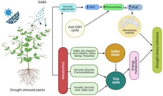 The protective role of GABA against drought-stress-induced oxidative damage has been demonstrated in a variety of plant species (Figure 2). In Phaseolus vulgaris L., for example, exogenous foliar application of GABA increased fresh shoot weight, dry shoot weight, and leaf area. Through osmotic adjustment, GABA improved drought tolerance in Phaseolus vulgaris L. [] (Table 1).