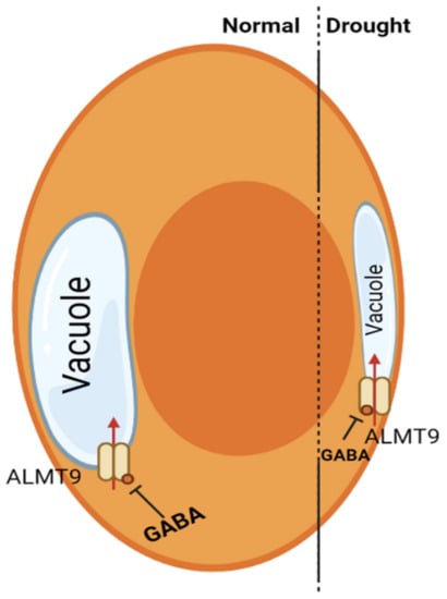 Stomatal guard cells, due to their essential functions in plant cell signaling and their capacity to respond to and incorporate multiple stimuli, have emerged as a prominent model system for elucidating numerous important pathways that regulate plant biotic and abiotic stress tolerance [,]. The effects of GABA on stomata have been observed in a variety of plants, including dicot and monocot crops. Recently, GABA and the ALMT1 protein have been discovered to influence plant development through the binding of GABA to the ALTM1 transporter [,]. The authors characterized the relationship as typical of ALMT family proteins and speculated that it might alter stomatal movement. ALMT6, ALMT9, and ALMT12 proteins are located in the vacuolar and plasma membranes, and play a role in regulating stomatal movement by enabling malate influx and efflux [,]. Meyer et al. (2011) [] suggested the existence of a cofactor (cytosolic or vacuolar) that binds to and controls the action of the ALMT6 protein since removing Ca2+ from the activated protein had no effect on activity. In recent years, Xu et al. 2021 [] revealed a GABA signaling route in plants, which is described by the simplified models provided in Figure 3. This work suggested that cytosolic GABA signals generated by GAD2 affect stomatal opening, water-use efficiency (WUE), and drought tolerance by negatively controlling the activity of ALMT9. ALMT9 is a key component for the transduction of GABA signals in cells under well-watered and drought conditions (Figure 3). However, the effect of GABA on stomatal closure under drought is still not clear. In addition, preceding research concluded that GABA regulation of stomata might be caused by light, dark, and low signal intermediate concentrations.