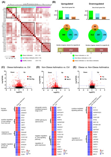 Differentially expressed genes of both low type-2 obese asthma and non-obese asthma phenotypes using a significance threshold cutoff for FDR < 0.1. (A) Correlation matrix of 75% of the detected genes for 10 obese asthmatics ”OA, green”, 10 non-obese asthmatics “NOA, turquoise”, and 10 healthy controls “Ctrl, purple”. (B) Proportional Venn diagrams showing the specific and shared genes of obese asthmatics vs. Ctrl (healthy controls), non-obese asthmatics vs. Ctrl, and obese asthmatics vs. non-obese asthmatics. (C–E, up) Volcano plots presenting differentially expressed genes of the three comparisons. (C–E, down) Heatmaps showing the top significantly 10 up and downregulated genes with some of the associated biological processes (GO terms, p < 0.05).