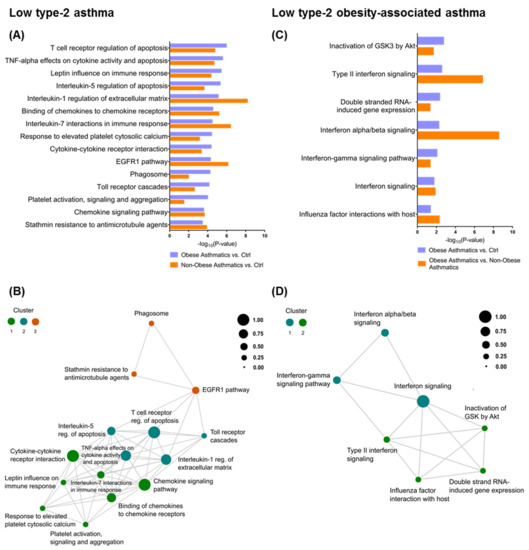Biological pathway analysis utilizing Bioplanet database with significance threshold of p < 0.05. (A) Bar plot presenting the top 15 significant pathways shared between obese asthmatics vs. Ctrl (healthy controls) and non-obese asthmatics vs. Ctrl, alongside their (B) network analysis showing the association between the previous pathways (circle color corresponds to pathways cluster, circle size to the number of mutual genes between the corresponding pathways and all other connected pathways, circles proximity to the number of mutual genes between two pathways). (C) Bar plot presenting all significant pathways shared between asthmatics vs. Ctrl and obese asthmatics vs. non-obese asthmatics with their (D) network analysis.