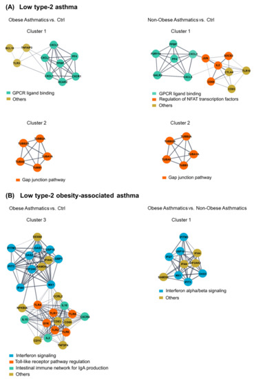 Clustering of dense network regions and their associated biological pathways. Gene clusters associated with shared pathways between ((A), left) obese asthmatics vs. Ctrl (healthy controls) and ((A), right) non-obese asthmatics vs. Ctrl, as well as between ((B), left) obese asthmatics vs. Ctrl and ((B), right) obese asthmatics vs. non-obese asthmatics.