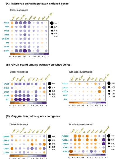 Correlation between clinical variables and biological pathways enriched genes. Pearson correlation between clinical assessments and (A) interferon signaling pathway enriched genes in obese asthma, (B) gap junction pathway enriched genes in both obese asthmatics and non-obese asthmatics, and (C) GPCR ligand binding enriched genes in both obese asthmatics and non-obese asthmatics.
