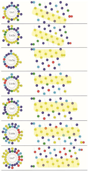 Group A peptides (Ltc1 and Ltc2a) consist of 25–26 residues and have a free C-terminus. They carry the highest net charge, resulting from 9 to 10 exclusively cationic groups without any anionic residues, besides 9–11 hydrophobic amino acids. In the helical mesh representation, it can be seen (better than in the helical wheel) that the strip of hydrophobic residues runs diagonally along/around the helix axis. Notably, in Ltc1, the hydrophobic strip is disrupted by two cationic residues (Lys10; Arg15), which is not the case in Ltc2a.