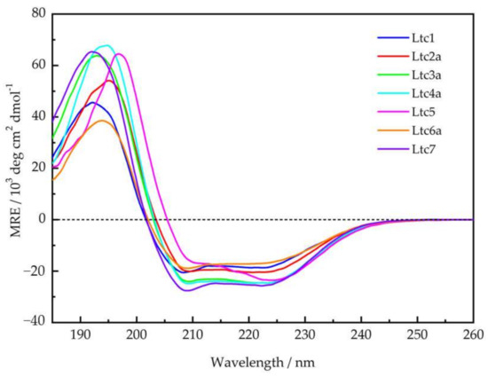 Most membrane-active peptides tend to be unstructured in aqueous solution, i.e., in the absence of lipids or a membrane-mimicking environment, and all latarcins were reported to be unstructured in water [7]. As a reference, we checked their secondary structure using solution CD in 10 mM phosphate buffer at a defined pH of 7 and found that all peptides are indeed largely unfolded under these conditions (Figure S2). Ltc3a shows a noticeable helical fold (ca. 30%) under these conditions. Next, we compared the secondary structure of the full set of latarcins in the presence of lipid membranes, for which there are no complete data available yet. Figure 2 shows that in the presence of small unilamellar vesicles composed of DMPC/DMPG (7/3), all latarcins fold into α-helices at a molar peptide-to-lipid ratio (P/L) of 1/50, as expected. A pronounced helicity had been reported in helix-promoting solvents, such as TFE/H2O (50/50 v/v) [7], with a positive band centered at 191 nm—with the exception of Ltc5, which had a positive band at 195 nm. In TFE, the two characteristic negative bands of an α-helix center at 208 nm and 222–223 nm were observed for all latarcins. In our lipid mixtures, however, several peptides show significant deviation from the idealized α-helix observed in TFE. While there is a relatively small variation in the spread of the negative band intensities among the latarcins, there is a noticeable shift in the positive maxima between the different peptides, as seen in Figure 2. Ltc1, Ltc3a, and Ltc7 show a positive band around 192-193 nm, while for Ltc4a and Ltc6a, the band is slightly shifted to 194 nm. Ltc2a shows a broad positive band at this wavelength, and Ltc5 displays the most prominent red-shift of the positive band with a maximum of 197 nm. The negative bands in Ltc5 are also shifted toward longer wavelengths. The change from an unordered structure or nascent helical conformation in the absence of lipids (Supplementary Figure S2) to a largely α-helical folded structure in the presence of lipids indicates that latarcins have a high tendency to bind to lipids and undergo a structural transition in response to their environment.