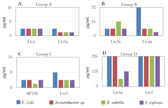 Minimal inhibitory concentration (MIC) values of all latarcins determined for two Gram-positive (Bacillus subtilis subsp. spizizenii and Staphylococcus xylosus) and two Gram-negative strains (Escherichia coli and Acinetobacter sp.). (A) Group A peptides (Ltc1 and Ltc2a); (B) Group B peptides (Ltc3a and Ltc4a); (C) Group C peptide (Ltc5) and positive control (BP100); (D) Group D peptides (Ltc6a and Ltc7).
