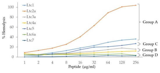 Compared to other antimicrobial membrane-active peptides, latarcins show rather low hemolytic activity, which makes this set of peptides interesting for further pharmacological optimization. A hemolysis assay was performed to determine the activity of latarcins against human red blood cells, allowing us to compare the results to those of previous experiments in which rabbit erythrocytes were used [7]. The activity was determined for each latarcin as a function of increasing concentration, up to a maximum of 256 µg of peptides per mL. The hemolytic activity of latarcins is seen to vary considerably among the different peptides. Figure 4 shows that Ltc2a exhibits 100% hemolysis at 128 µg/mL. The percentage hemolysis of the other peptides was determined at the highest tested concentration of 256 µg/mL. Our results show that Ltc1 resulted in 36% hemolysis, followed by Ltc5, which resulted in 27%. Ltc3a and Ltc4a showed low hemolysis of 16% and 12%, respectively, at 256 µg/mL. Ltc6a and Ltc7 had the lowest hemolytic activity (<3%). These hemolysis data demonstrate that peptides in any group show comparable activity, with the exception of Ltc 2a. Furthermore, our results show that the peptides with higher antimicrobial activity also display higher hemolytic activity, suggesting that this effect is due to an intrinsic perturbation on the lipid bilayer.