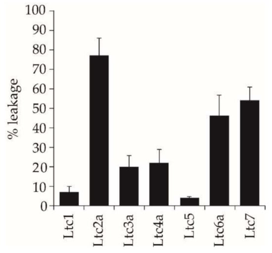The ability of the peptides to induce leakage in large unilamellar vesicles (≈120 nm diameter) of POPC/POPG (1/1) was studied using a fluorescence assay using ANTS/DPX, as described previously [16,17,18]. The different latarcins resulted in very different extents of leakage, as seen in Figure 5. The highly membrane-active peptide Ltc2a (a strongly antimicrobial and hemolytic agent) caused the most vesicle leakage (75%). Unexpectedly, Ltc6a and Ltc7, which had shown a very low antimicrobial and hemolytic activity, were found to give a high degree of 50% leakage. Ltc3a and Ltc4a induced 20% leakage, while Ltc1 and Ltc5 caused less than 8%. These data clearly demonstrate that the action of each peptide is highly dependent on the composition of the target lipid membrane.