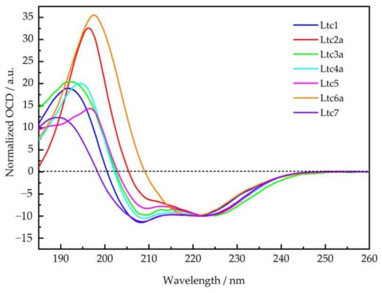 Figure 6 shows the OCD data of all latarcins measured in DMPC/DMPG (7/3) at a P/L of 1/100. This is the same lipid composition and peptide-to-lipid ratio as was used in conventional CD above (see Figure 2), but in contrast to the vesicular samples containing excess water, the oriented membranes for OCD are just about saturated with water. Our OCD results confirm that all peptides are α-helical in macroscopically oriented membrane samples, with the exception of Ltc6a. Notably, in the presence of excessively hydrated vesicles, Ltc6a also had the lowest helical fold according to conventional CD (Figure 2, Table S1). Here, in the absence of bulk water (Figure 6), it actually displays characteristic spectral features of a β-pleated conformation with a broad and intense positive band centered around 197 nm and a less intense negative band at 219 nm.