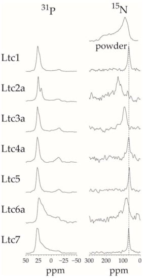 Except for Ltc6a, all other peptides were found to be helical in the oriented membrane samples according to OCD; therefore, we can now use the 15N-NMR spectra to determine their orientation in the membrane more accurately. Ltc1, Ltc4a, Ltc5, and Ltc7 give 15N-NMR signals around 70 ppm, indicating that these helices lie flat on the membrane surface. Ltc2a, with a chemical shift of 131 ppm, on the other hand, is distinctly tilted in the membrane, as was also observed in the OCD experiments. According to our previous analyses of similar helical peptides, this chemical shift corresponds to a helix tilt angle of around 30–40° away from the flat surface orientation [22,23,24]. Ltc3a, with a chemical shift of 93 ppm, is tilted only slightly by 10–20°. Ltc6a has a relatively broad 15N-NMR signal at 82 ppm, and the 31P-NMR spectrum shows that this peptide strongly perturbs the lipid bilayer. Given that OCD had shown distinct signs of aggregation into β-sheets, we can conclude that Ltc6a binds to the membrane and perturbs the lipid bilayer, but it is not possible to determine the molecular alignment of Ltc6a when it has most likely formed aggregates.