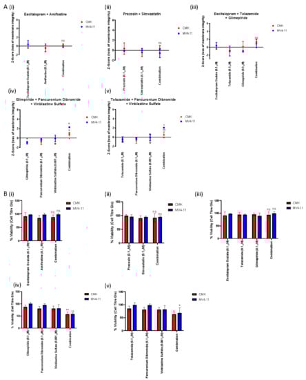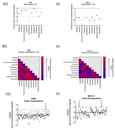 As the main focus of this work was to identify a robust drug combination, there were nine combinations across both cell lines that demonstrated an increase in RFU indicating induction of cell death. Of particular interest was Plate 13 Well 115 as the 10 compounds within this well (glipizide, prazosin, pancuronium dibromide, carbachol, escitalopram oxalate, simvastatin, tolazamide, amifostine, vinblastine sulfate and glimepiride) had minimal or no effect as single agents on the viability of either cell line. In contrast, as a combination, the drug pool resulted in a 3-fold increase in Z-score in both cell lines; this combination was shown to demonstrate the highest Z-score for both cell lines (Figure 2A). To identify a potential synergistic combination, the 10-compound combination was deconvoluted into 45 pairwise combinations and 120 triple combinations. The viability of these combinations was tested over a period of 72 h at a final concentration of 0.1 µM with the exception of vinblastine sulfate, which had a final concentration of 0.001 µM as this concentration was more clinically achievable. Initial investigations looked at the Z-score of each of the 10 compounds as single agents; all of the compounds demonstrate a Z-score < 2 in both CMK (Figure 2A(i)) and MV4-11 (Figure 2A(ii)) cell lines, while the 10-compound combination demonstrates a Z-score > 2. Deconvolution into 45 pairwise combinations demonstrated variability in each cell; the pairwise combination with the highest Z-score (increased loss of membrane integrity) for the CMK cell line was escitalopram oxalate, a selective serotonin reuptake inhibitor (SSRI) [], and amifostine, a cytoprotective adjuvant [] (Z-score = 2.19) (Figure 2B(i)), while the highest-scoring pairwise combination for the MV4-11 cell line was prazosin, an alpha-1 blocker [], and simvastatin, a lipid-lowering medication [] (Z-score = 2.04) (Figure 2B(ii)). Further to this, all 120 triple combinations for this 10-compound combination were investigated, and similar to the pairwise combinations, each cell line demonstrated variability. For the CMK cell line, one triple combination demonstrated a Z-score > 2; this was escitalopram oxalate in combination with two sulfonylureas [,], tolazamide and glimepiride (Z-score = 2.06). Two triple combinations that generated a Z-score > 2 were observed in MV4-11 cells, which included a sulfonylurea (either tolazamide or glimepiride) in combination with pancuronium dibromide, a neuromuscular relaxant, and vinblastine sulfate, a chemotherapeutic agent (Z-score = 2.13 and 2.30, respectively) (Figure 2C). These pairwise and triple combinations were taken forward for validation and further analysis.