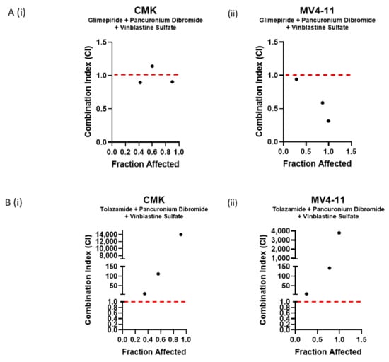 Investigating the synergistic potential of successful combinations using combination index (CI) values. (A) Combination index values calculated using the Chou and Talalay method for the combination of glimepiride, pancuronium dibromide and vinblastine sulfate in the (i) CMK and (ii) MV4-11 cell lines. CI > 1 is antagonistic, CI = 1 is additive and CI < 1 is synergistic. This combination demonstrated synergism at multiple concentrations across both cell lines. (B) Combination index values calculated using the Chou and Talalay method for the combination of glimepiride, pancuronium dibromide and vinblastine sulfate in the (i) CMK and (ii) MV4-11 cell lines. CI > 1 is antagonistic, CI = 1 is additive and CI < 1 is synergistic. This combination demonstrated antagonism at all concentrations across both cell lines.