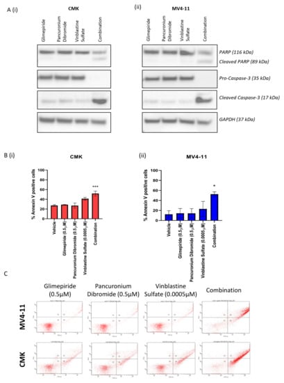 The triple combination of glimepiride, pancuronium dibromide and vinblastine sulfate induces cell death in paediatric AML cell lines. (A) Western blot analysis of PARP, procaspase-3, and cleaved caspase-3 in the (i) CMK and (ii) MV4-11 cell lines following 72 h treatment with glimepiride (0.5 µM), pancuronium dibromide (0.5 µM) and vinblastine sulfate (0.0005 µM) as single agents and as a combination. GAPDH was used as a loading control. Results shown are representative of three independent experiments. (B) Flow cytometry analysis of annexin V-positive cell population for the (i) MV4-11 and (ii) CMK cell lines following 72 h treatment with glimepiride (0.5 µM), pancuronium dibromide (0.5 µM) and vinblastine sulfate (0.0005 µM) as single agents and as a combination. (C) Flow cytometry plots of annexin V-positive cell population for the (i) MV4-11 and (ii) CMK cell lines following 72 h treatment with glimepiride (0.5 µM), pancuronium dibromide (0.5 µM) and vinblastine sulfate (0.0005 µM) as single agents and as a combination. ns = nonsignificant, * = p < 0.05, *** = p < 0.001.