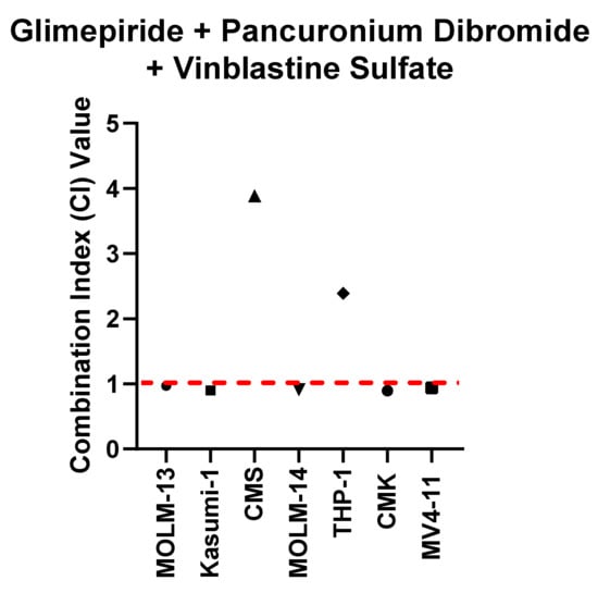 A panel of paediatric AML cell lines were treated with the combination of glimepiride (0.5 µM), pancuronium dibromide (0.5 µM) and vinblastine sulfate (0.0005 µM) for 72 h and combination index values were subsequently calculated using the Chou and Talalay method. CI > 1 is antagonistic, CI = 1 is additive and CI < 1 is synergistic.