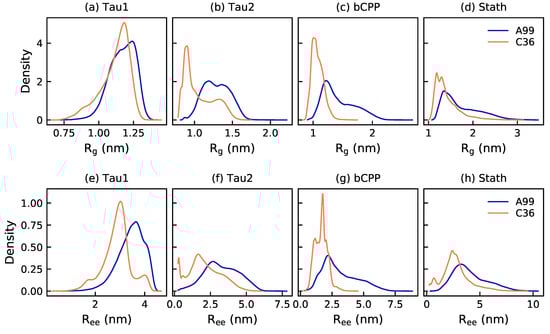 Distribution of the radius of gyration (top row) and the end-to-end distance (bottom row) of Tau1, Tau2, bCPP, and Stath simulated with Amber ff99SB-ILDN (A99) and CHARMM36m (C36). The legend applies to all panels.